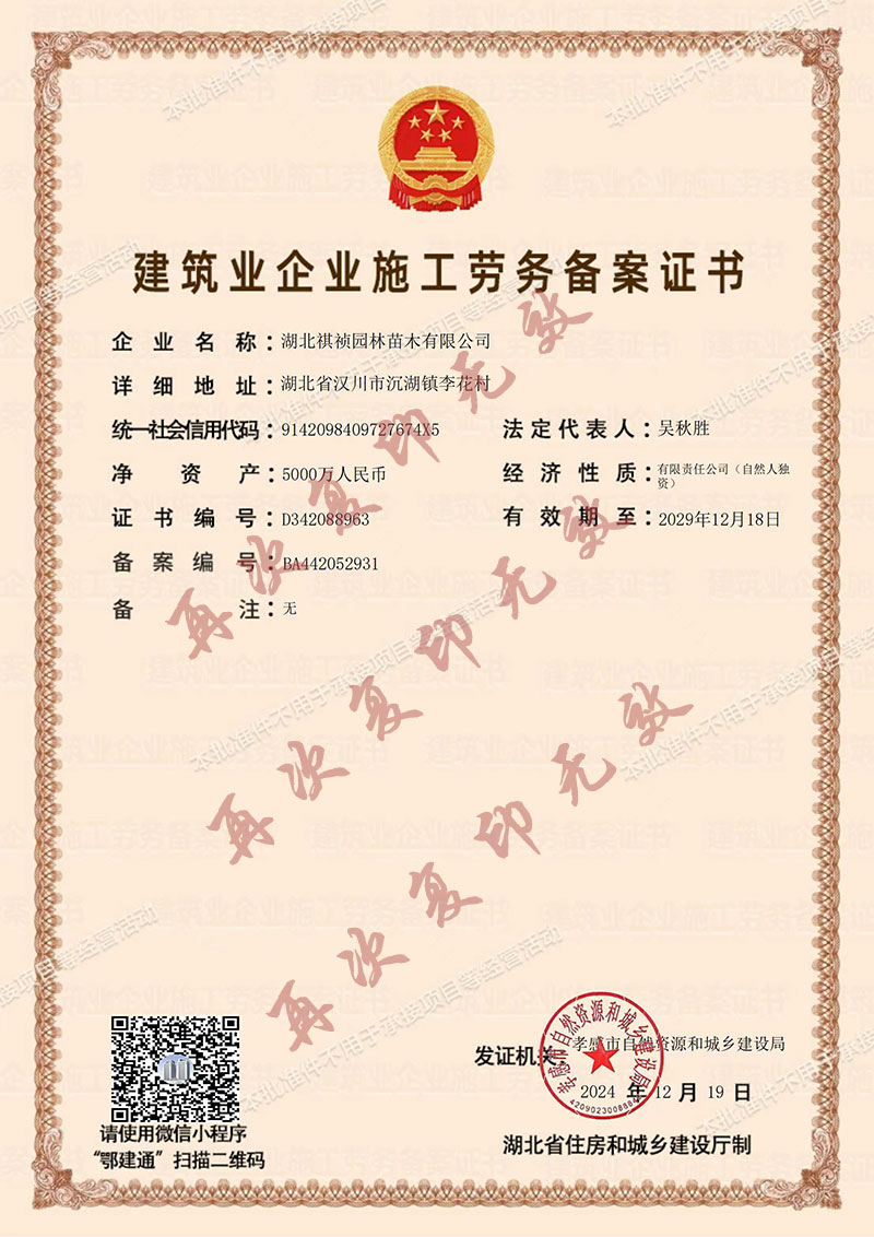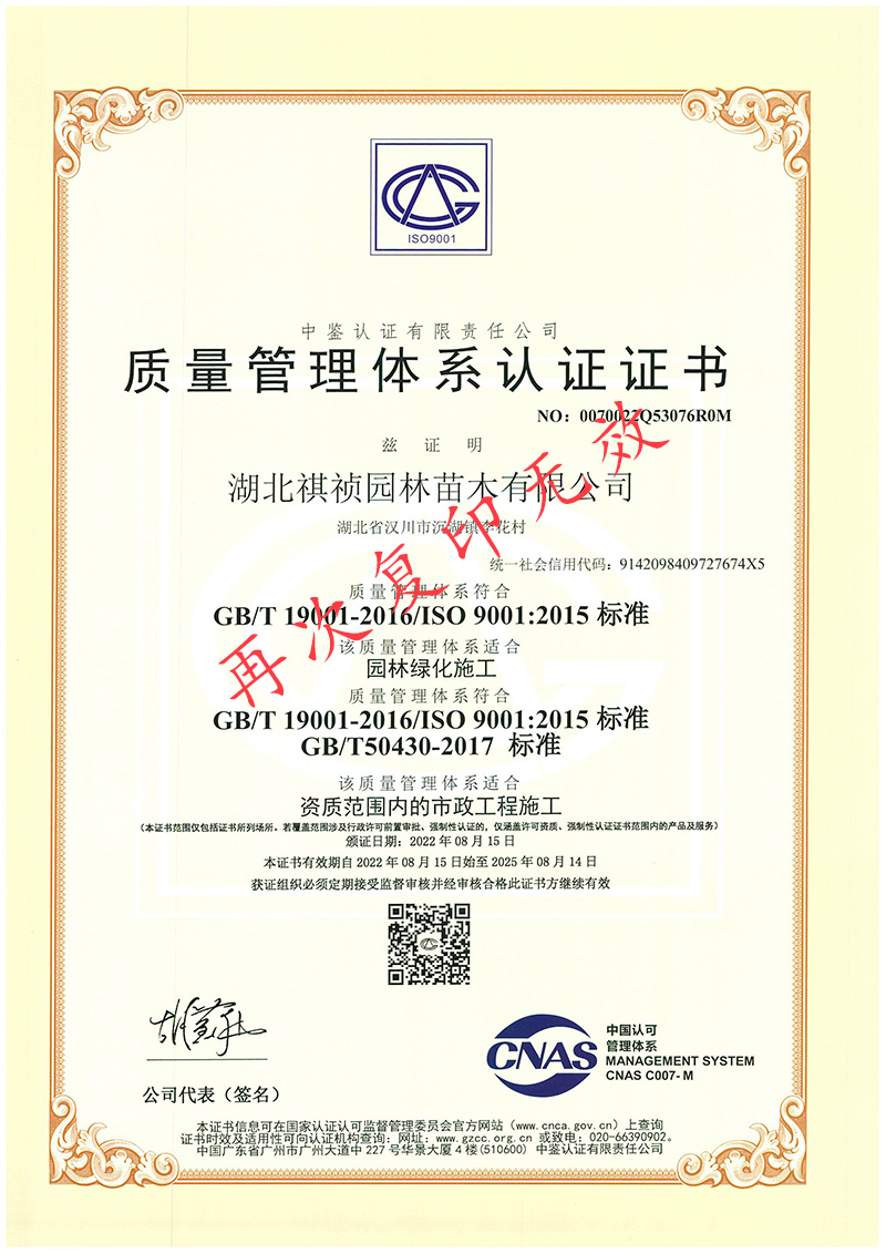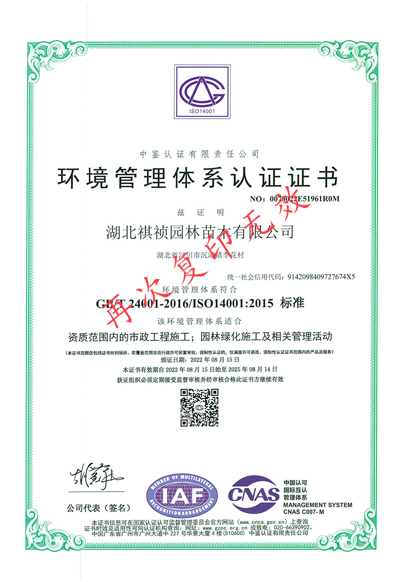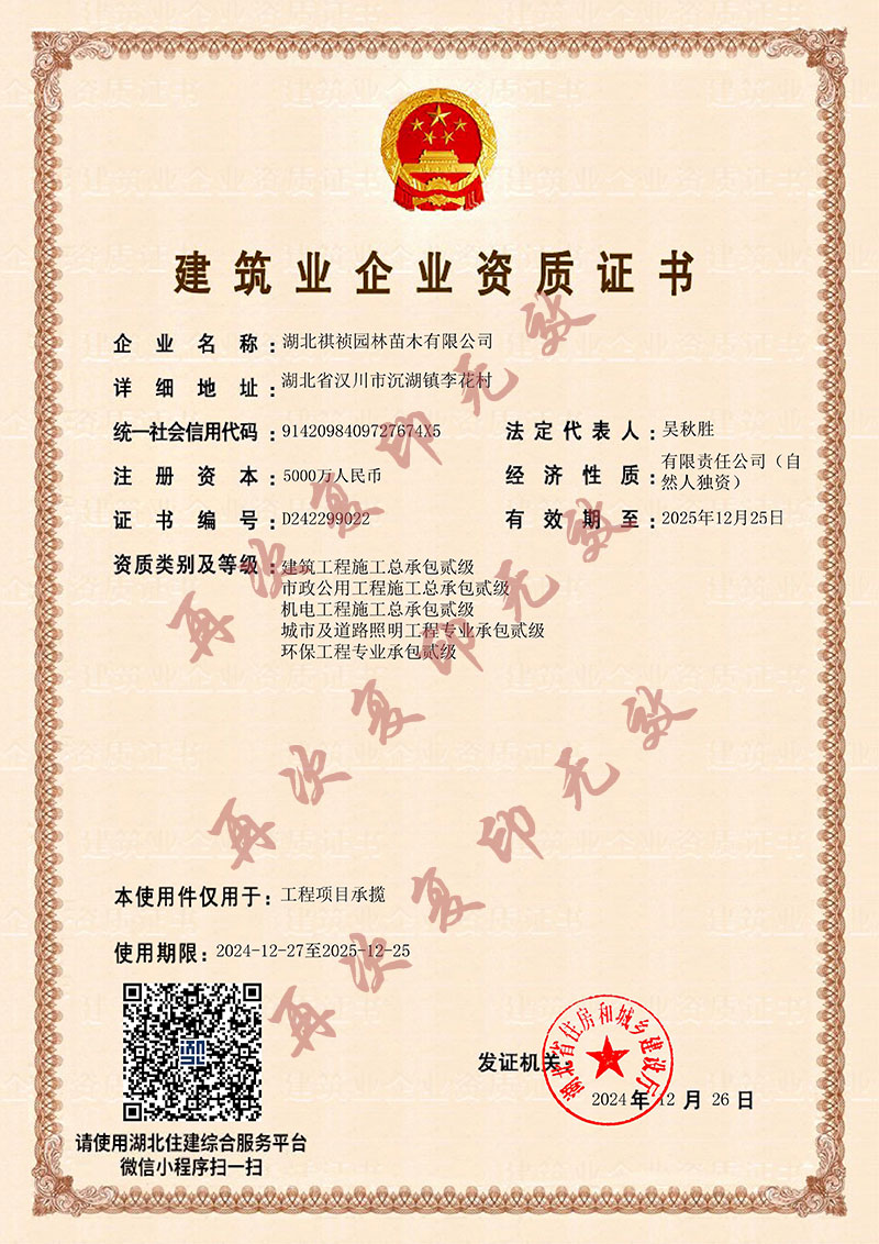 湖北祺禎園林苗木有限公司是一家專(zhuān)門(mén)致力于發(fā)展現(xiàn)代林業(yè)、苗圃花卉、旅游觀(guān)光、休閑娛樂(lè)、園林市政環(huán)保工程建設(shè)于一體的湖北省林業(yè)產(chǎn)業(yè)化省級(jí)龍頭企業(yè),公司具備城市園林綠化、建筑工程施工總承包、市政公用工程施工總承包、機(jī)電工程施工總承包、城市及道路照明工程專(zhuān)業(yè)承包、環(huán)保工程專(zhuān)業(yè)承包、施工勞務(wù)資質(zhì)不分等級(jí)等多項(xiàng)建筑業(yè)企業(yè)資質(zhì),先后獲得湖北省林業(yè)產(chǎn)業(yè)化省級(jí)重點(diǎn)龍頭企業(yè)、AAA級(jí)信用等級(jí)企業(yè)、孝感市“守合同重信用榮譽(yù)證書(shū)”、“五一勞動(dòng)獎(jiǎng)”等榮譽(yù)及質(zhì)量管理、環(huán)境管理、職業(yè)健康安全管理三大體系認(rèn)證。